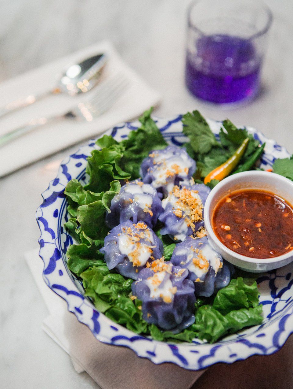 Steamed Purple Dumplings of Ground Chicken, White onion, Peanuts & Sweet Radish. Served with Fried Garlic, Thai Chili, Cilantro & Black Vinegar Sauce