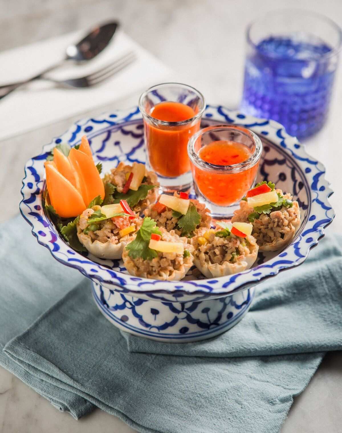 Savory Pastry Cups of Ground Chicken, Corn Green Beans, Carrot, Oyster Sauce & Pineapple. Served with Honey-Chili & Sriracha Sauce