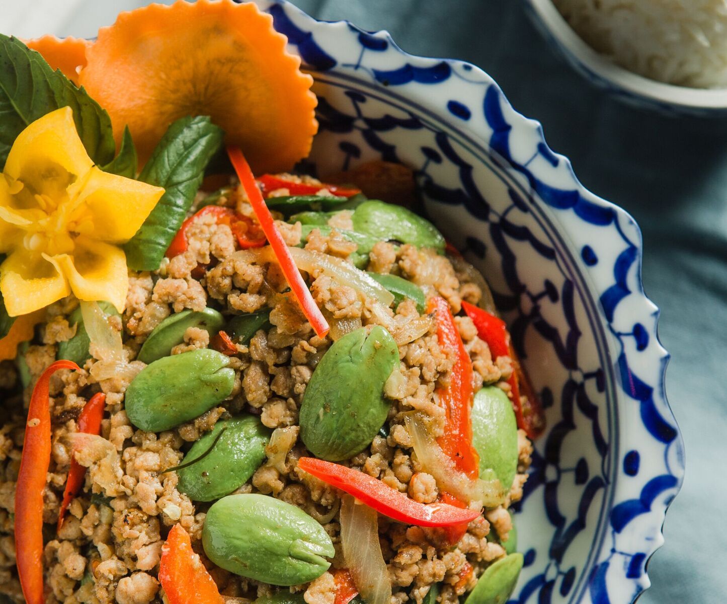 An Aromatic Dish with Flavors of Sator Bean, Thai Chili, Garlic, White Onion, Bell Pepper & Oyster Sauce. Stir-Fried with Your Choice of Ground Pork, Ground Chicken or Shrimp.